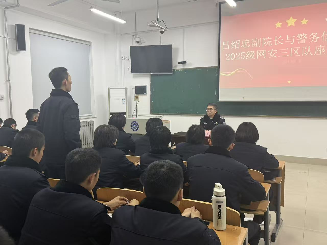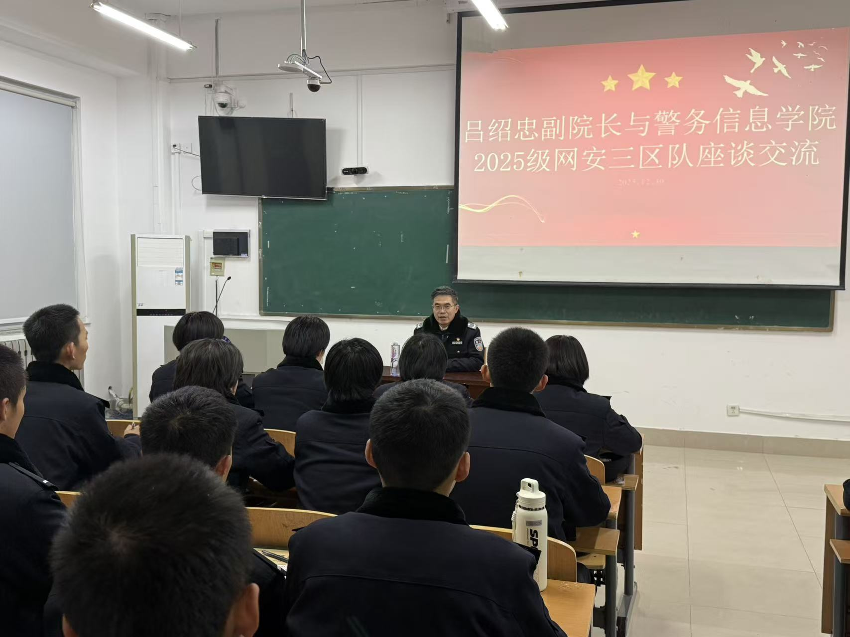 为扎实推进领导干部联系学生工作走深走实,进一步密切师生交流,2025年12月30日晚,山东警察学院党委委员、副院长吕绍忠来到警务信息学院,与2025级网络安全与执法三区队全体同学进行面对面座谈交流,警务信息学院大队长刘彦彤一同参加座谈。