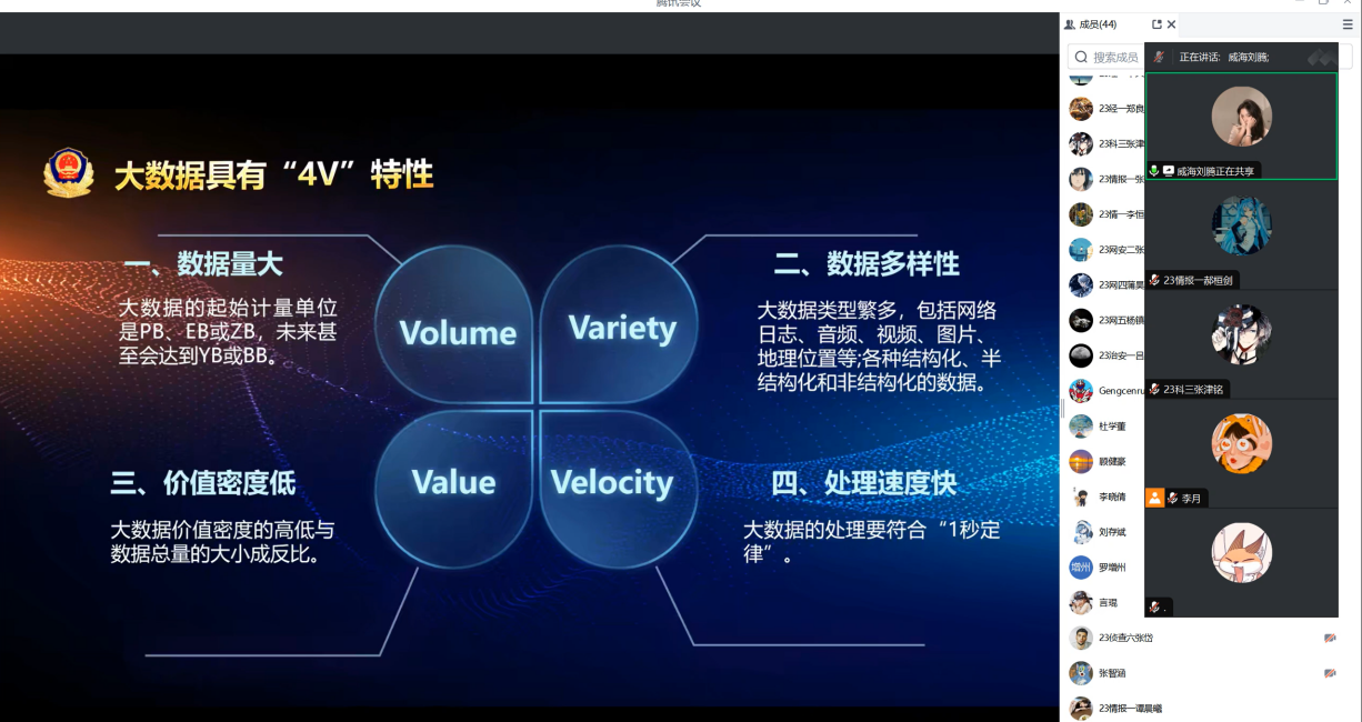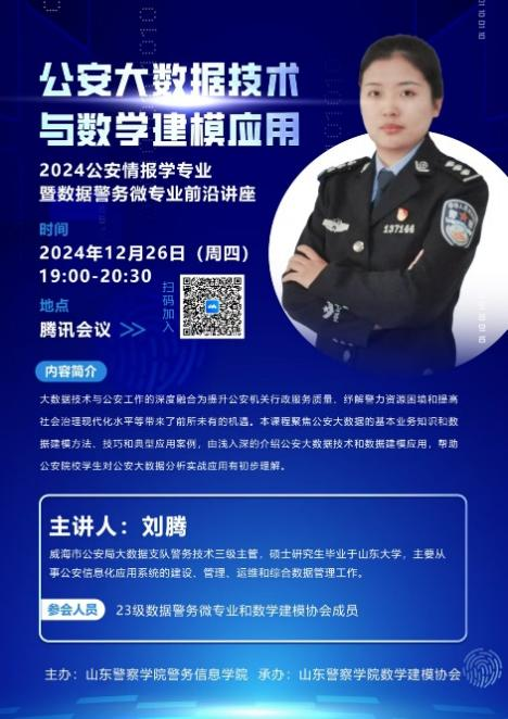 讲座以线上的方式,特邀威海市公安局大数据支队警务技术三级主管刘腾担任主讲,2023级数据警务微专业全体学生、数学建模协会骨干成员和数据警务教研室成员参加。此为“2024公安情报学专业暨数据警务微专业前沿系列讲座”的收官之作。